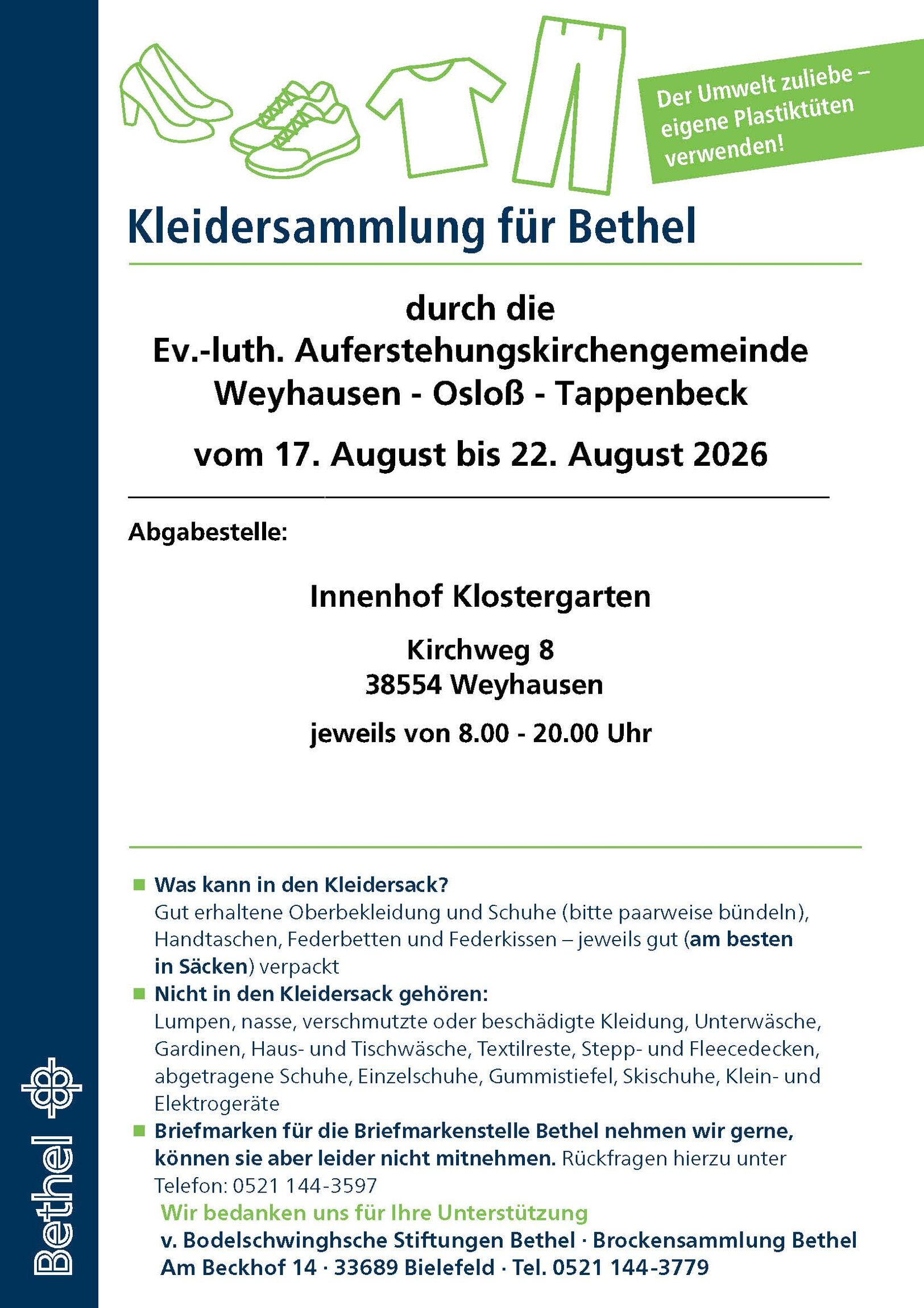 Die nächste Kleidersammlung findet bei uns erst vom 17. August bis 22. August 2026 statt.