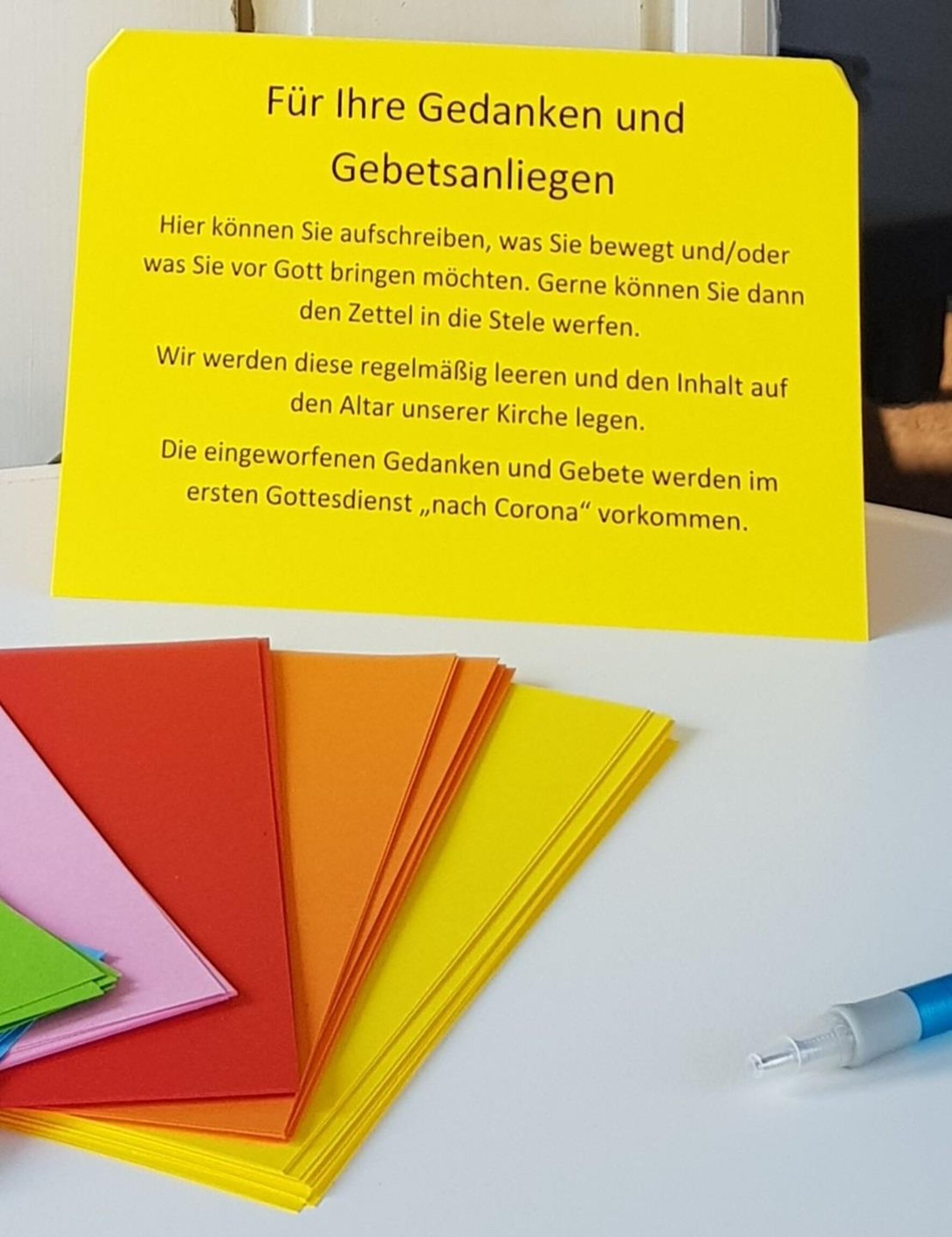 Kurze Andachtstexte und Meditationen liegen zum Mitnehmen bereit. Gerne können Sie auch Ihre Gebetsanliegen auf den vorbereiteten Blättern notieren und in die Stele werfen.